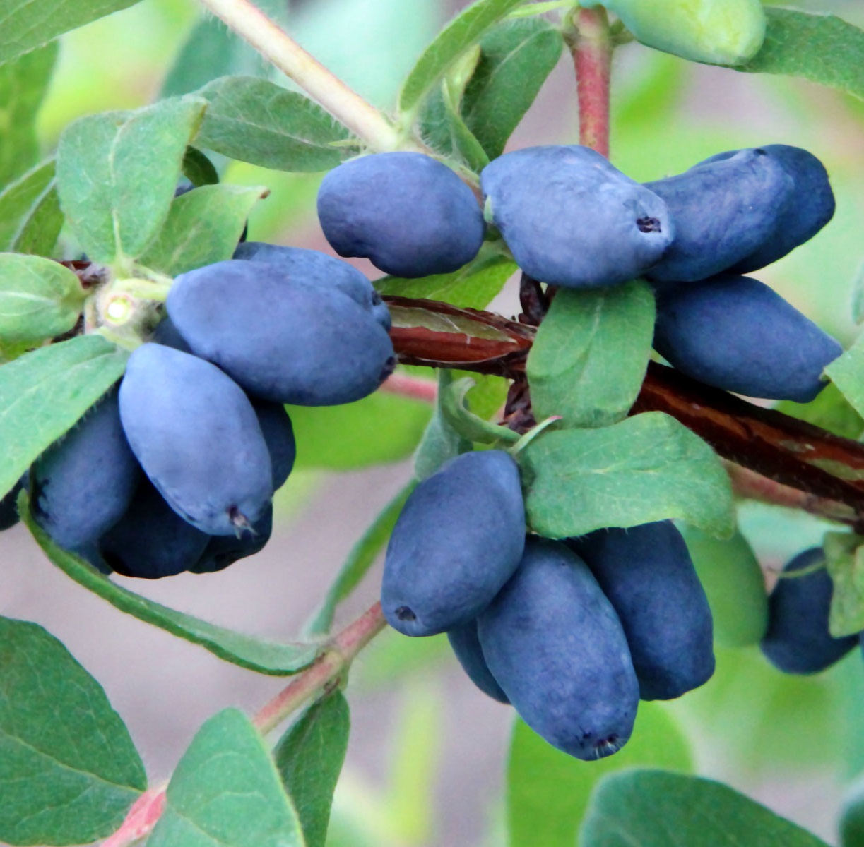 Например, жимолость George Bugnet, Marie Bugnet (Канада), ягоды которой созревают в период с июня по август и долго не осыпаются. У сорта Amur (Германия) и Blue-Grey (США) удлиненные ягодки с изумительным вкусом и полным отсутствием горечи.