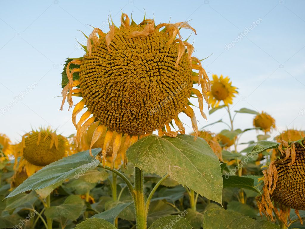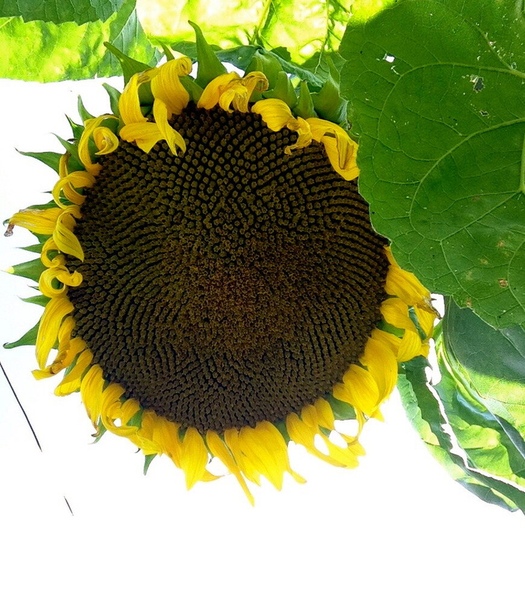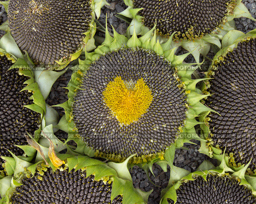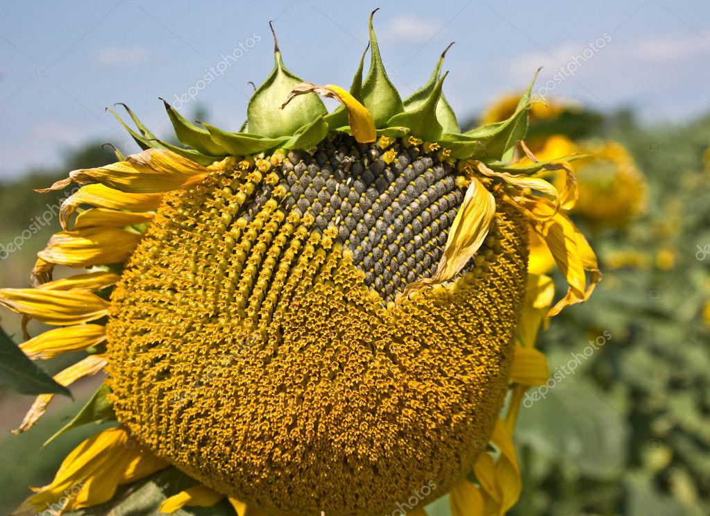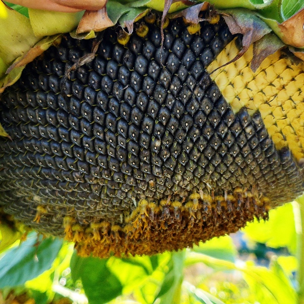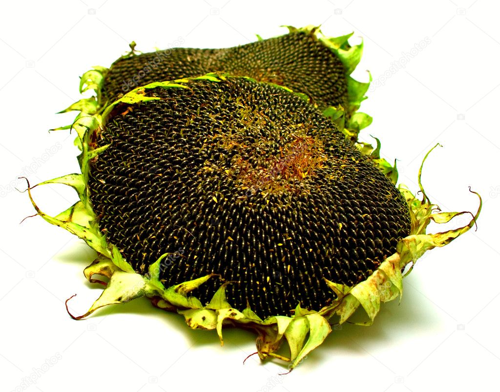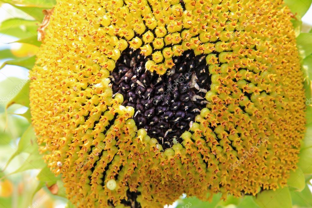 Завязи дисковых цветков созревают в полосатые семянки, продаваемые на рынках как семена подсолнечника. Вся голова покрыта зелеными перекрывающимися прицветниками, называемыми филлариями.