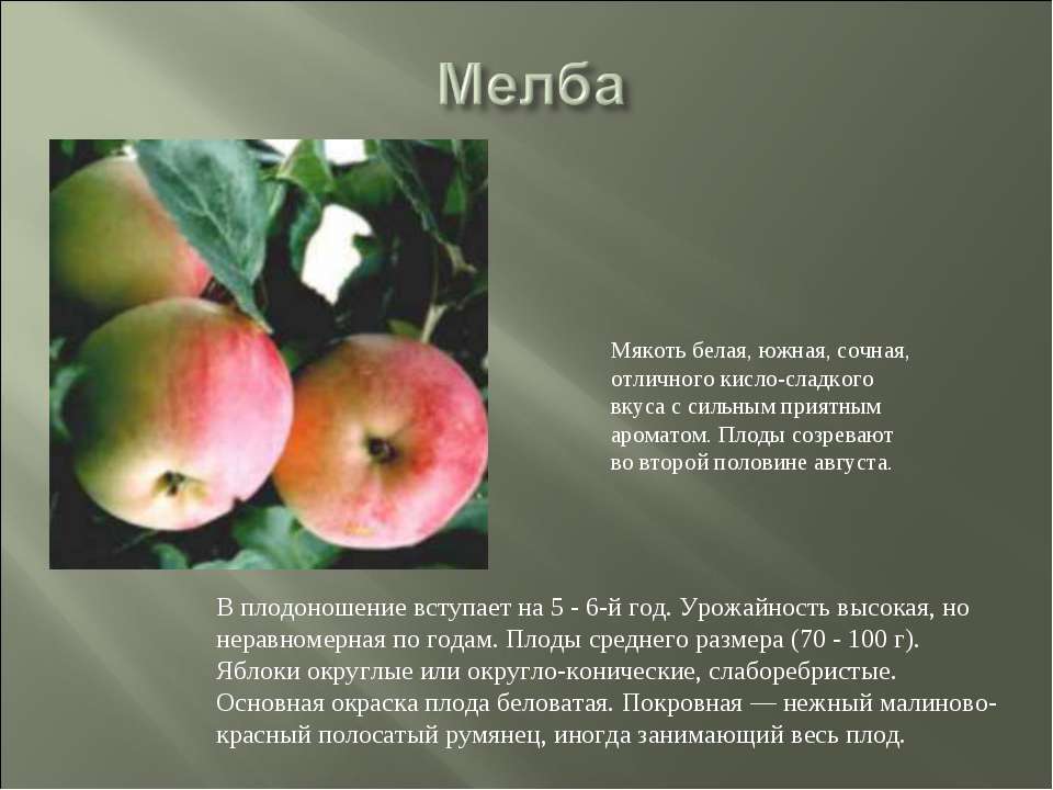Летний сорт яблони, выведенный в Канаде в 1898 году из семян сорта Мекинтош, полученных от свободного опыления и названый так в честь австралийской певицы Нелли Мелбы (1861—1931). Плоды 110-130 г зеленовато-желтые, с интенсивным размыто-полосатым, красным румянцем и сизым налетом.