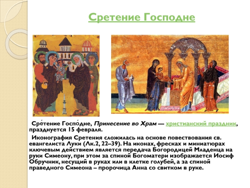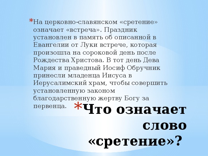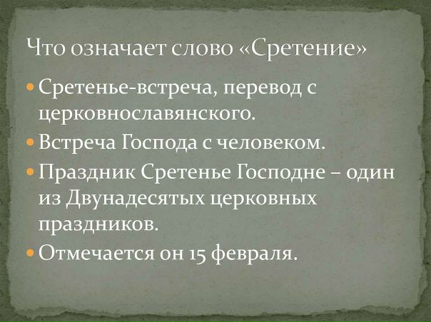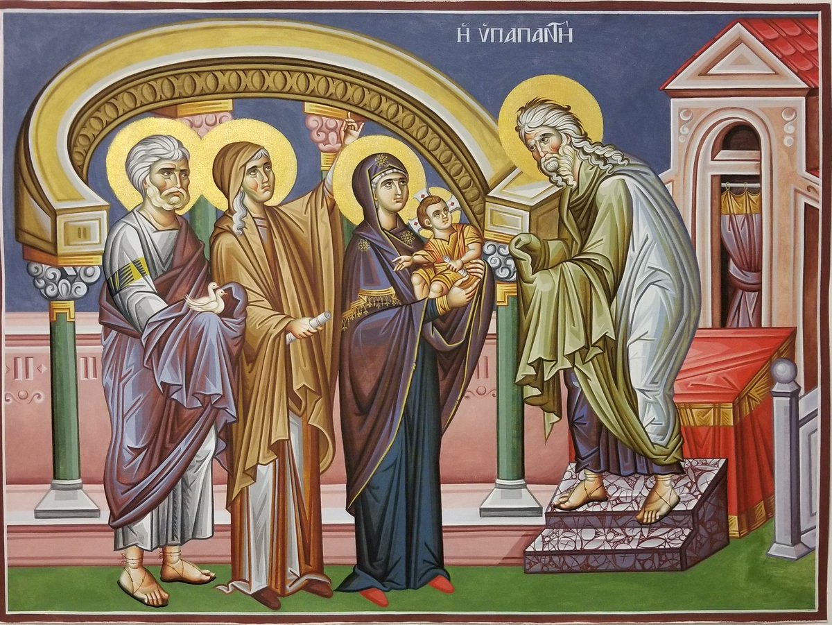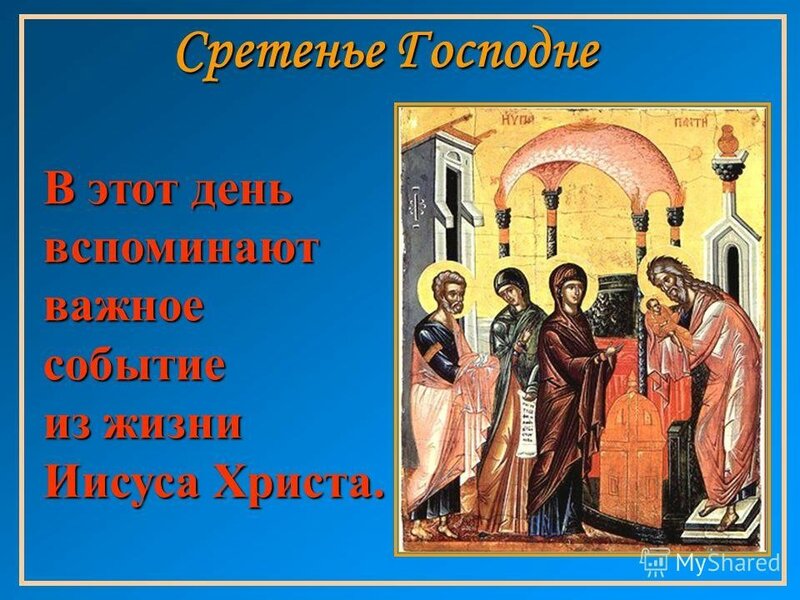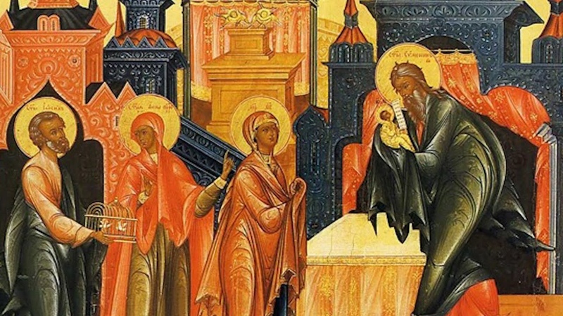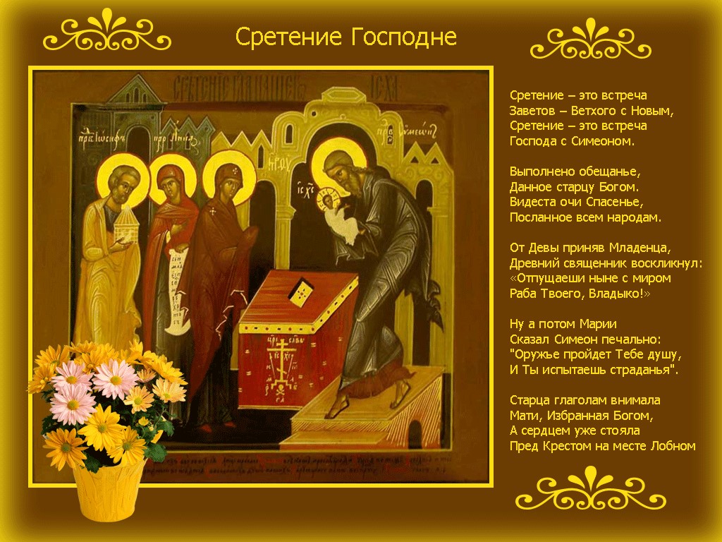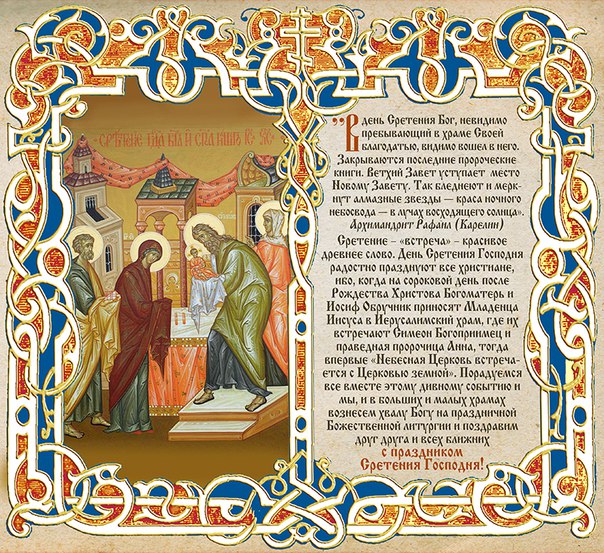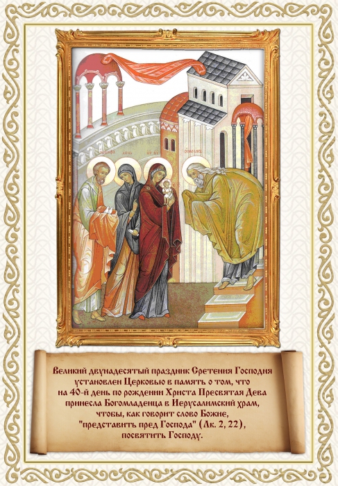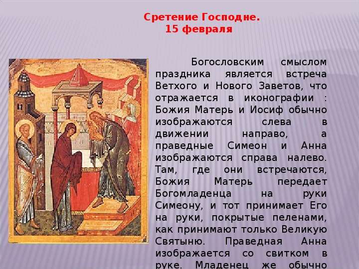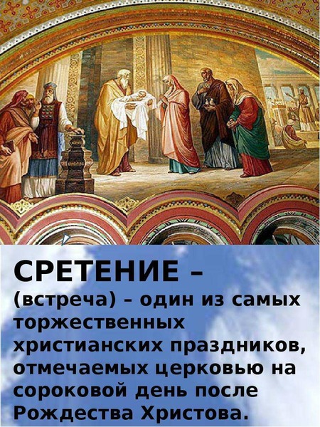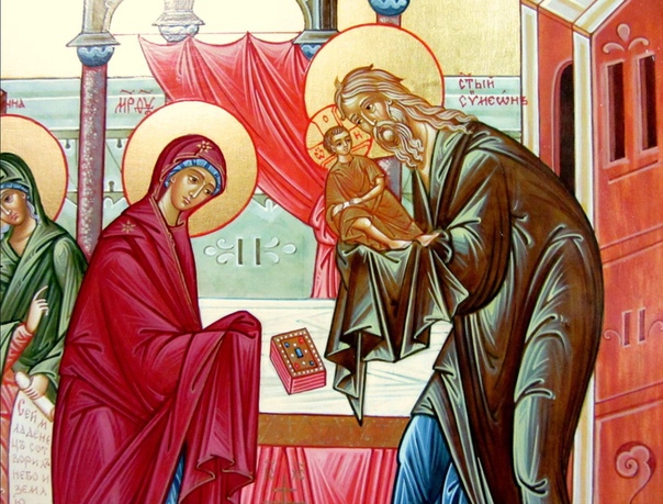 В этот день Церковь вспоминает события, описанные в Евангелии от Луки — встречу со старцем Симеоном младенца Иисуса в иерусалимском храме на сороковой день после Рождества.