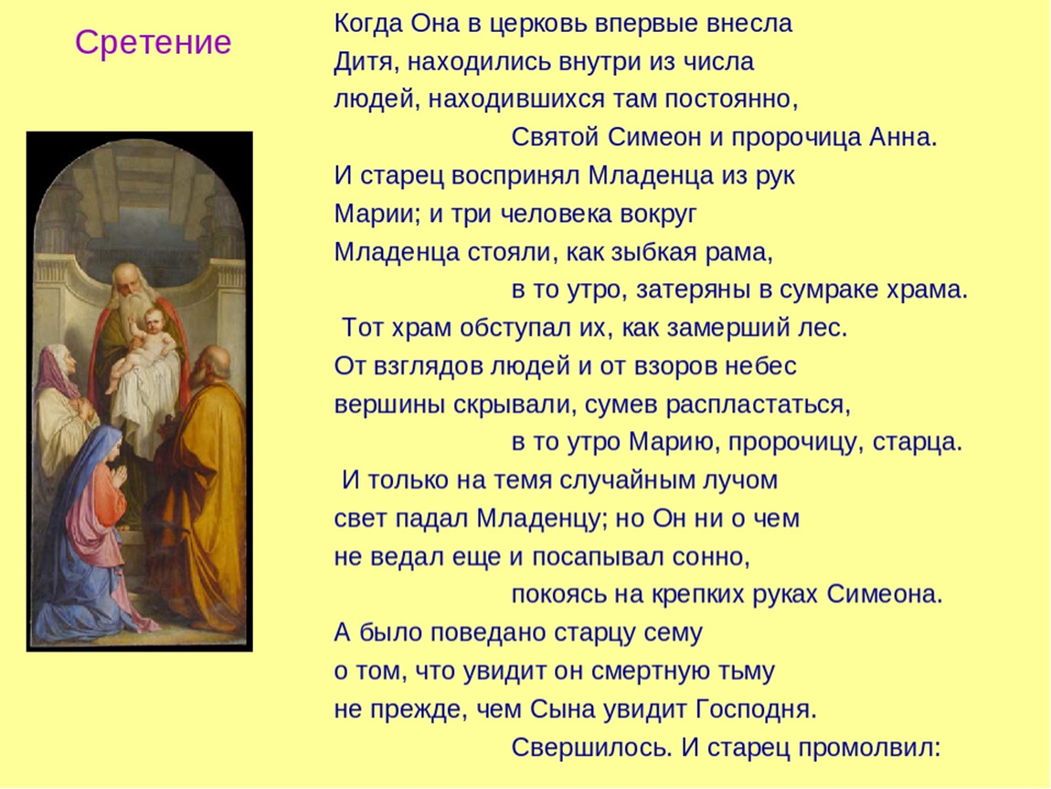 И вот, день пришел. Исполнилось то, что ученый ждал всю свою непосильно долгую жизнь. Симеон взял на руки Младенца, рожденного от Девы, — а значит, пророчество Ангела исполнилось.