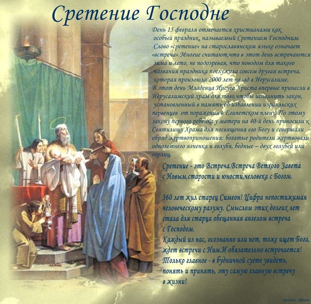 15 февраля (2 февраля по старому стилю) православные отмечают великое Сретение Господне.