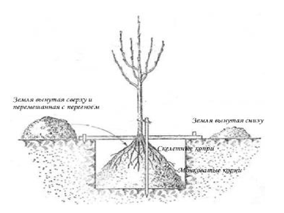 Глинистые почвы улучшают внесением песка, компоста, песчаный грунт нуждается в добавлении торфа, перегноя. Перед весенней посадкой почву перекапывают, лучше это сделать заранее, еще осенью. Места посадки саженцев отмечаются посадочными кольями, к ним позднее будут подвязаны молодые яблони.