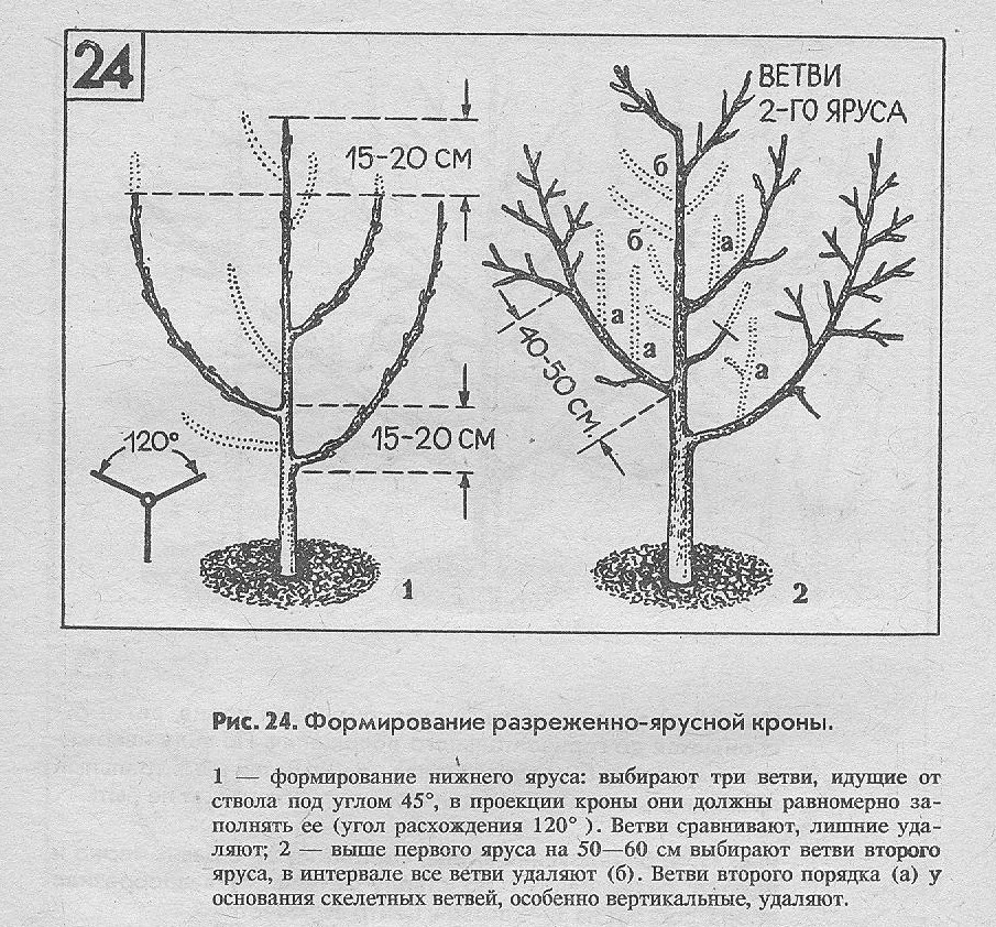 На второй год после посадки ранней весной у молодых деревьев начинают формировать кроны. Для этого срезают появляющиеся в зоне штамба ответвления и слишком сильно растущие вертикальные ветки, удаляют часть прошлогоднего прироста (приблизительно на треть укорачивают побеги длиной более 60 см), ограничивая таким образом рост яблонь в высоту и стимулируя разрастание веток в стороны.