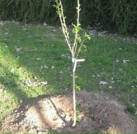 Подвязку лучше сделать мягкой тряпочкой или плёнкой, так как шпагат может повредить нежную молодую кору. Не забудьте сделать так называемое «блюдце для полива». Полить саженец после посадки нужно обязательно даже в дождливую погоду, в последующие дни поливом злоупотреблять нельзя. Если Вы высаживаете больше одного саженца, то расстояние между ними должно быть около 4 метров. Иногда бывает, что саженец куплен, а посадить его у Вас не хватает времени. Выкопайте небольшую ямочку, положите в неё саженец, присыпьте землёй корень и хорошо полейте. Так Вы можете хранить деревце в течение недели при пасмурной погоде или на протяжении 2-3 тёплых солнечных дней.