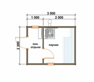 Минимальные размеры бани, рассчитанной на 2–3 человека, составляют 1,9×2,1 метра. Она комплектуется одной большой скамейкой для принятия процедур в положении сидя или лежа.