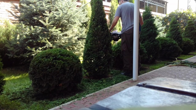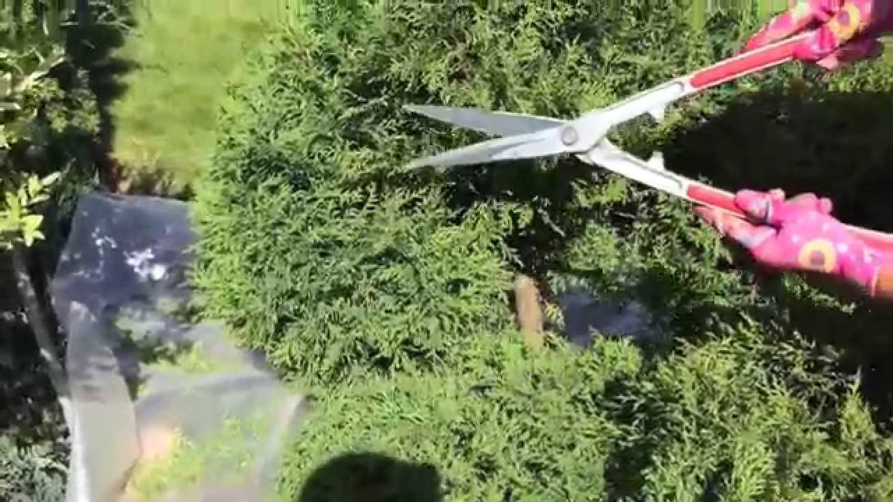 Небольшая толщина и гибкость габитуса при обрезке не создают препятствий для лезвий секатора — главное, чтобы инструмент был заточен, иначе легко травмировать дерево. Длина ручек садовых ножниц дотянется до любой высоты, серпу поддастся древесина крупных веток. Смола хвойных может вызвать аллергию и плохо отмывается с кожи, поэтому используйте рабочие перчатки и защитную одежду. Если вы являетесь владельцем обширных туевых насаждений или задумали несколько замысловатых фигур из кустарников, стоит серьёзней подготовиться к их обрезке.