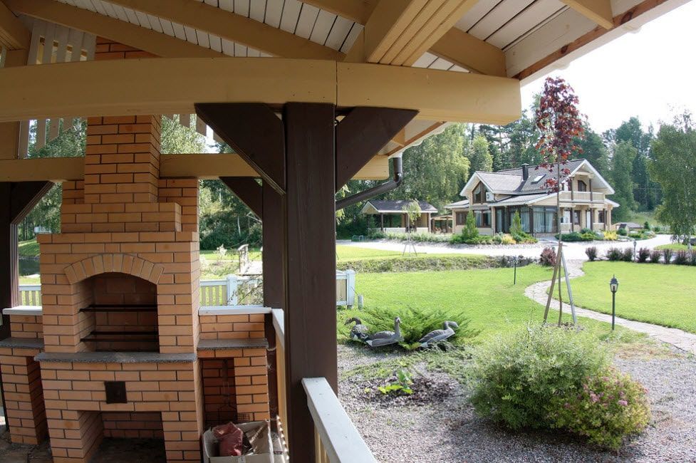 Зону барбекю строят полуоткрытого типа с использованием высококачественного кирпича или камня. Такое решение позволяет получить оптимальный уровень циркуляции воздуха и хорошее проветривание места для отдыха. Для отделки пола применяется керамогранитная плитка и другие материалы устойчивые к случайному возгоранию.