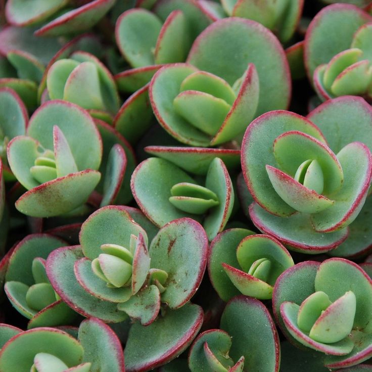 Формирует вечнозеленые розетки крошечных сине-зеленых сочных листьев щитообразной формы, которые в прохладную погоду становятся розовыми.