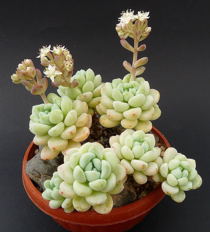 Избранная форма очитка с привлекательными пестрыми листьями, зелеными с розовыми и белыми краями. Рыхлые кисти розово-красных цветов. Лучше всего растет на хорошо дренированной, гравийной почве, не переувлажненной зимой. Засухоустойчивый. После укоренения требует немного воды.