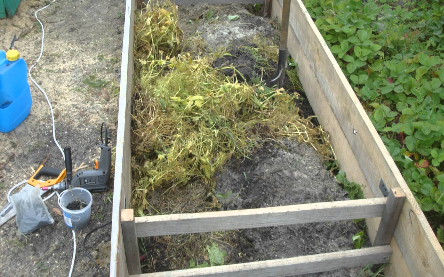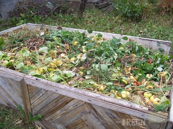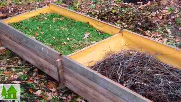 Внутренности наполняются органическим материалом. Подошвой служат трухлявые остатки деревьев или весенний обрез сада. В средней части собирают убранную ботву от плодоносивших однолетних растений, отрезки хлопчатобумажной ткани, ненужные плоды ягод, яблок, груш и т.д. Если начался листопад на деревьях, то его также прибавляем в укладку в виде наружной части со скошенной травой.