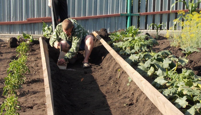 Выкапывается траншея, дно которой укладывают старыми деревянными досками. Со временем это материал тоже начнет перегорать вместе с органикой. Затем вы можете выложить слой веток, опилок, перегноя, пищевые отходы, сухие листья бумагу, ботву здоровых растений, перепревший навоз — все, что будет перегнивать и давать тепло.