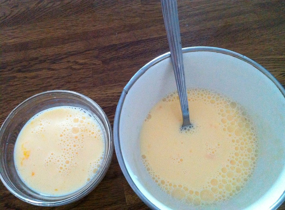 Яйцо хорошенько вымойте и разбейте в миску. Яйцо лучше всего брать домашнее, с ярким желтком. Тогда кляр будет иметь более яркий и аппетитный вид. Влейте в миску с яйцом холодное молоко. Молоко может быть любой жирности, но обязательно свежее и хорошего качества.