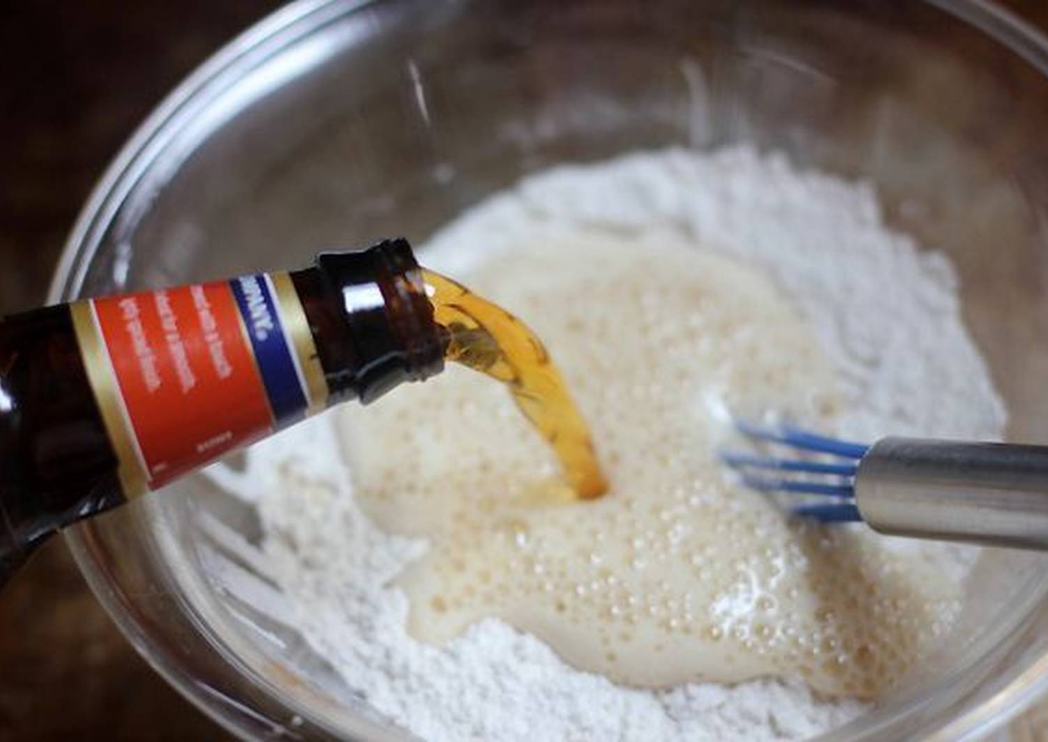 В большой миске взбейте вместе муку, разрыхлитель и пиво до образования однородного жидкого теста.