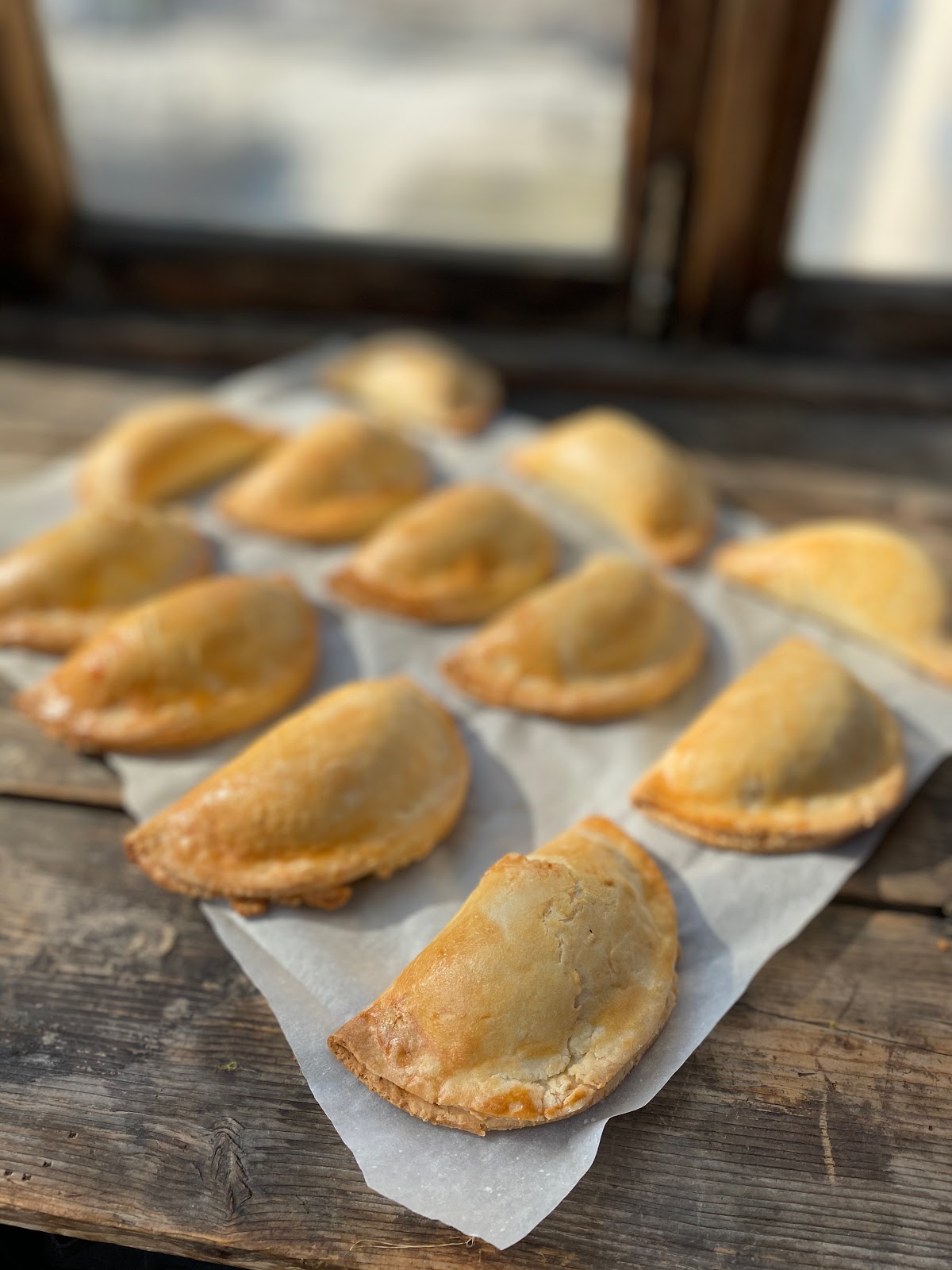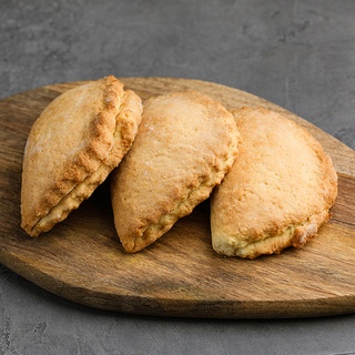 Накройте начинку второй половинкой лепешки, чуть прижмите, чтобы получился сочник в виде полукруга. Края не соединяйте, начинка должна немного «выглядывать» из-под верхнего слоя теста.