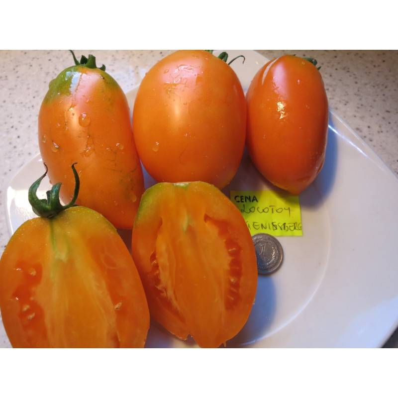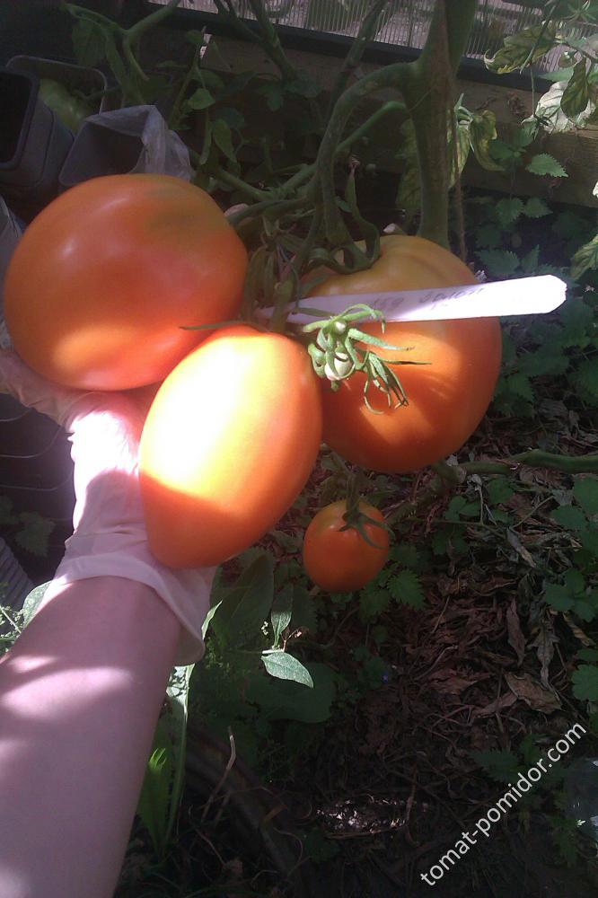 Плоды средних габаритов, около 150-200 граммов весом. Первые экземпляры, которые появляются на нижних кистях, могут быть и больше. Форма их варьируется от яйцевидной и сердцевидной до цилиндрической, или перцевидной. Цвет кожицы и мякоти солнечный, желто-оранжевый. Некоторые любители сравнивают их с хурмой.