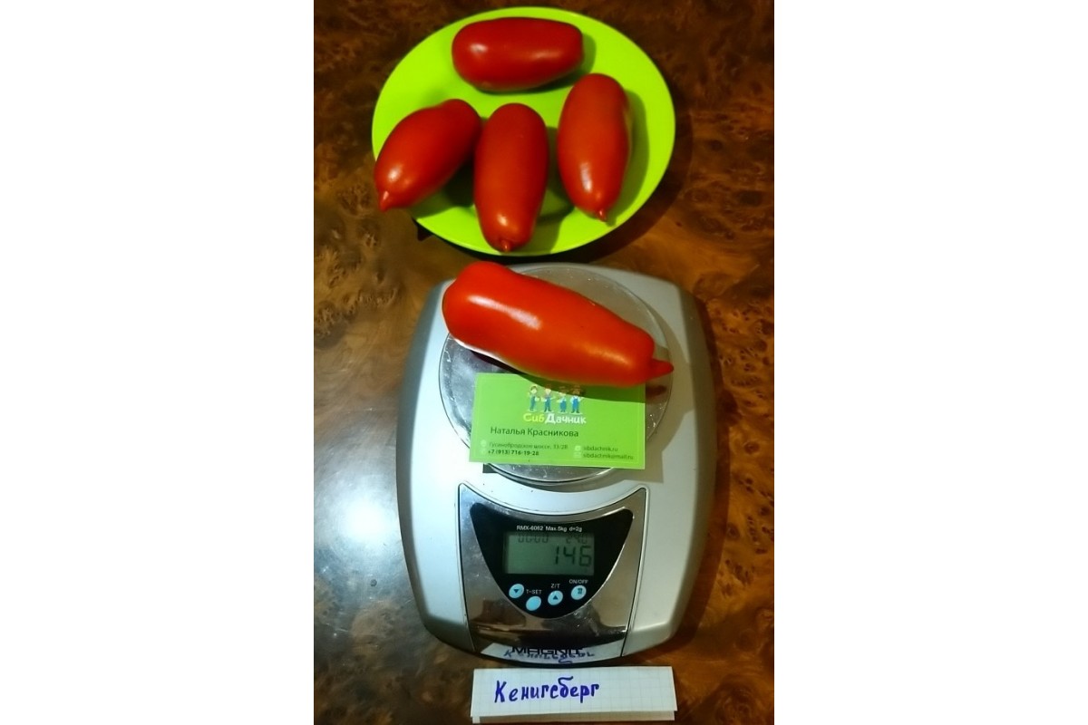 Tomat Koenigsberg ruĝa rilatas al varioj de averaĝa matureco, адаптируйте аль кресткадо аль ла libera aero.Ĝi estis kreita danke al la verkoj de siberiaj bredistoj-amantoj. La vario distingas per siabonega rendimento: la arbustoj estas laŭvorte ŝprucitaj kun fruktoj, la maso de ĉiu el kiuj proksimume ĉirkaŭ 300 gramojn. Фруктой имеет лонган формон, киу аспектас киель мелонгеной. Tomatoj de la Koenigsberg-vario havas Bonegajn Gustajn Kvalitojn, или estas konservataj dum longa tempo kaj povas Bone konserviĝi. La rendimento де ла vario estas egala аль дю ау три rubujoj да помидор эль ĉiu arbusto. Sur unu kvadrata метро де ла лито povas loki tri plantojn.