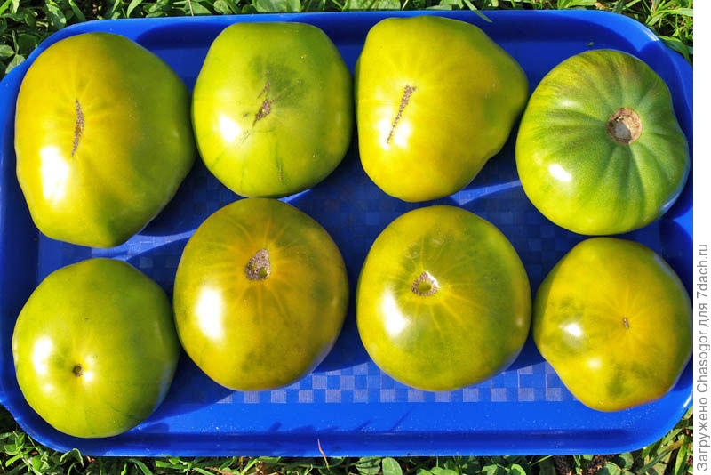 Специалисты рекомендуют делать по 2 стебля. Кстати, с одного куста не будет много пасынков. Плоды имеют стандартную форму. Поверхность немного ребристая. Цвет — зеленый. Когда плод созревает, то кожура приобретает желтовато-зеленоватый оттенок, но желтизна выражена только нечастыми вкрапления на кожуре. Эти сорта помидоров дают плоды весом по 200 г. Максимальный вес — не более 350 г. Мякоть очень вкусная и имеет приятный запах. Есть необычная кислинка.