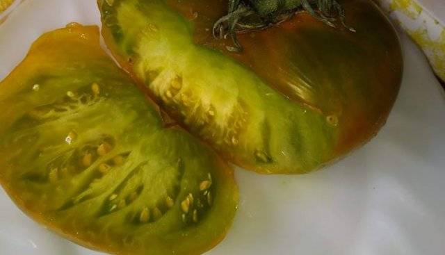 Плоды отличаются округлой немного плоской формой, а их цвет — болотный. Вес одного плода не более 200-300 г. Сорт очень урожайный. Мякоть сладковатая, имеет яркий зеленый цвет. Эти помидоры подойдут и для приготовления сока, и для свежего употребления. Такая экзотика понравится каждому.