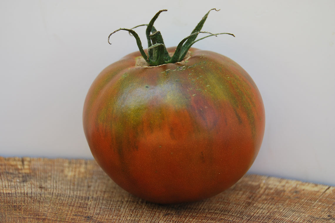 Среднеспелый, индетерминантный сорт. Ценится за высокие вкусовые качества и экзотический вид плодов. Помидоры очень крупные (до 500 г), плоскоокруглой формы, зеленовато-коричневой окраски, вкусные, мясистые, сладкие. На срезе каждый плод имеет индивидуальный рисунок мякоти. Преобладающие цвета мякоти – красный, розовый, желтый и зеленый.