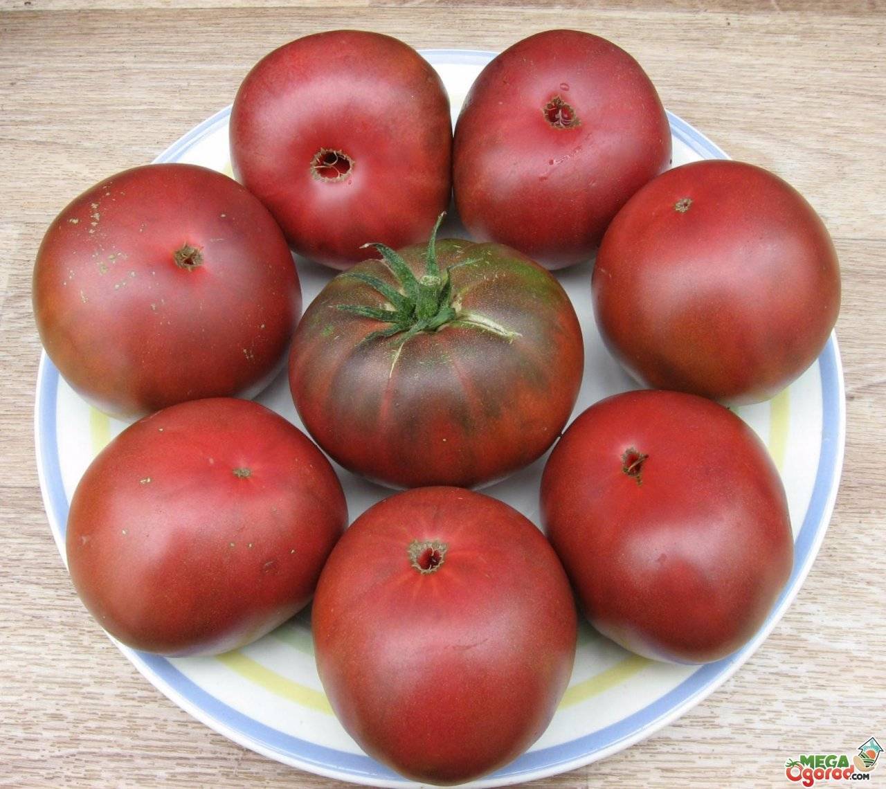 Индетерминантный, среднеспелый сорт для салатов и переработки на сок. Плоды очень крупные (до 400 г), плоскоокруглые, шоколадно-вишневого цвета, сочные, сладкие. Урожайность высокая.