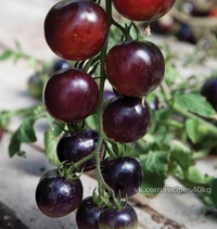 Созревание помидоров продолжается до начала осени. Сорт ценится за высокие вкусовые качества, иммунитет к фитофторе, серой и вершинной гнили. Цвет спелых томатов – насыщенный фиолетовый, почти черный. Помидоры собраны в плодовые кисти по 6-8 штук на каждой. Гладкие, круглые томаты относятся к коктейльному типу весом 50-70 г.