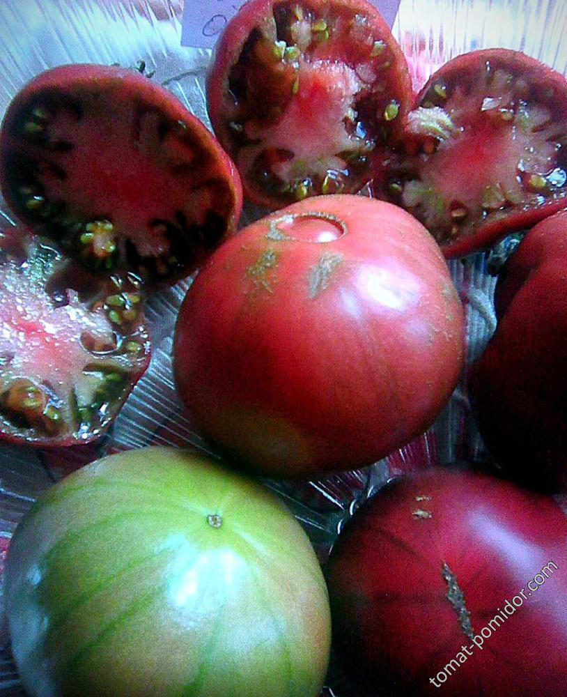 Фиолетовая Тыква – высокорослый сорт, спелость средняя, плоды темно-сиреневые в виде тыковок. Вес плода достигает 250 г, помидорки сочные, со сладким привкусом. Сорт Шмель – низкорослое растение, плоды растут гроздями по 2-4 помидора, малиново-розовые с зелеными полосками.