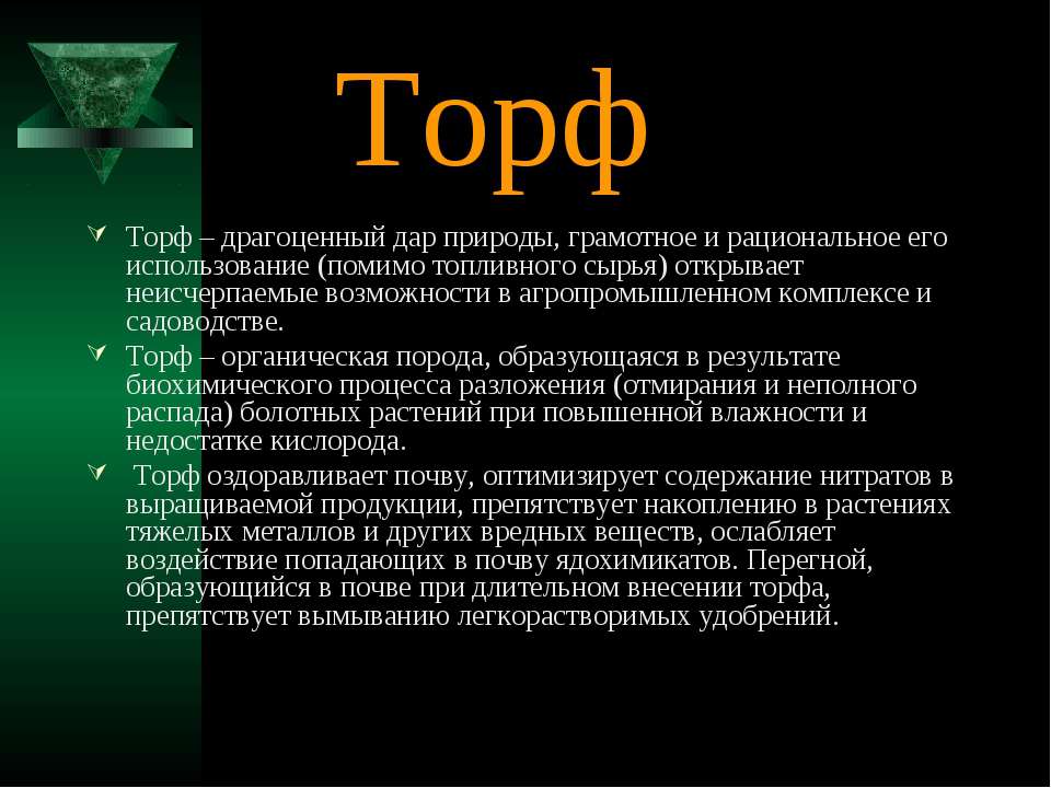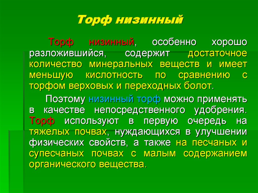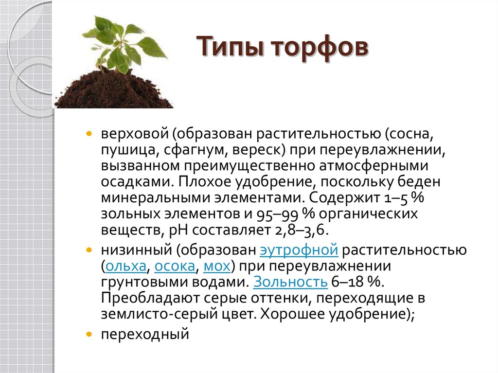 В торфе содержится много органических веществ и гумуса. Но микроэлементы не всегда доступны растениям в полной мере. Кислотность материала высокая. Поэтому в чистом виде торф редко используется как удобрение. Для такой цели подходит лишь низинный вид, с высокой степенью разложения и реакцией, близкой к нейтральной.