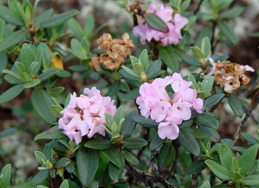 Рододендрон даурский в диком виде растет в Сибири и на Дальнем Востоке. Его высота может достигать 2 м, обладает короткими листьями, цветет в мае. Сибирские целители назначают настой листьев в качестве потогонного, мочегонного, болеутоляющего средства.