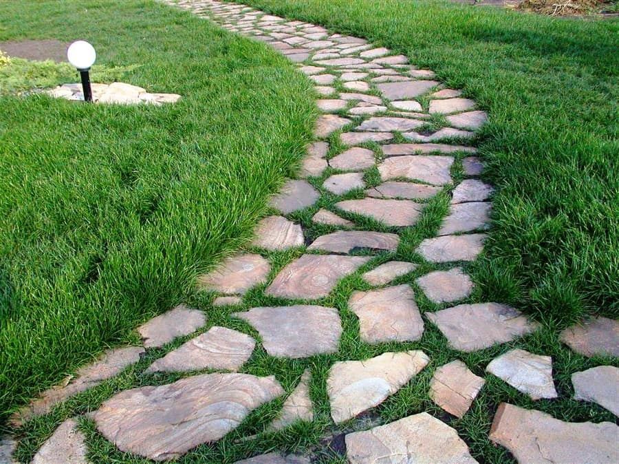 Очень красиво смотрятся дорожки, где между камнями выложили плодородную землю и высадили семена для газона.