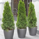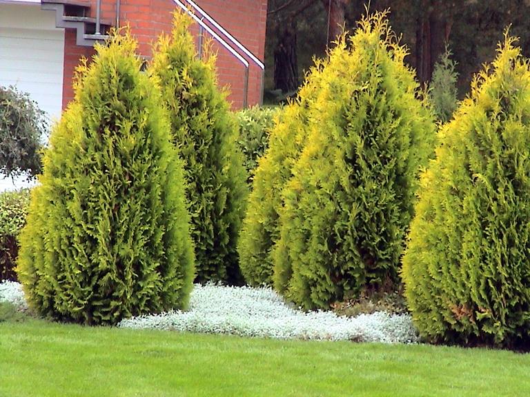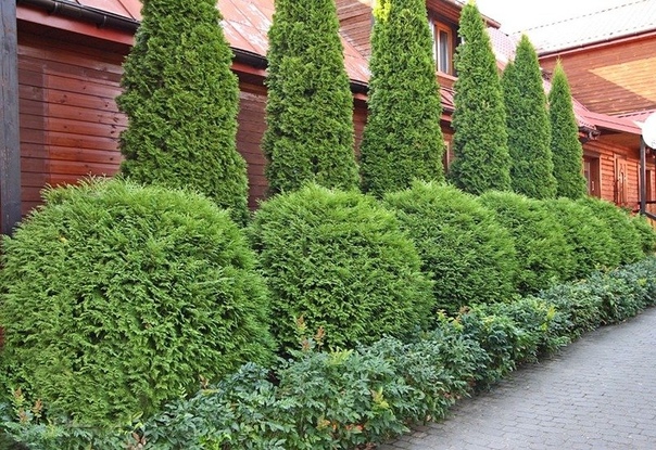 Для озеленения обычно используют растения кеглевидной, конусовидной или колонновидной формы. Например: