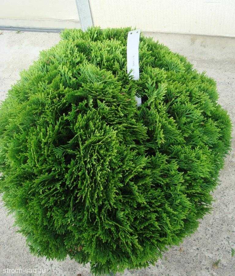 Самая популярная форма низкорослой туи. Дерево вырастает до 60 см. Имеет плотную шаровидную толщу, состоящую из многочисленных восходящих плоских ветвей. Морозостоек и нетребователен к грунту.