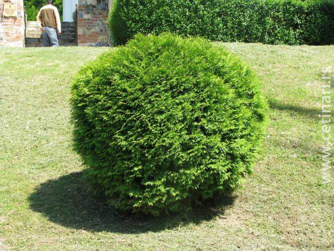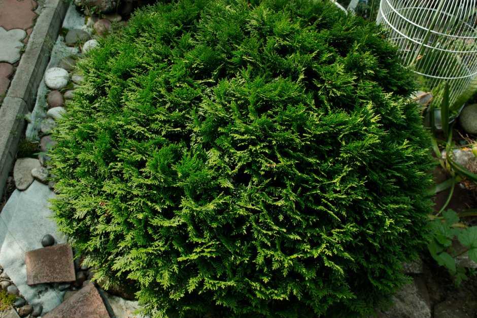 Туя маленькая, декоративная, шаровидная. Имеет очень густую ярко-зеленую крону.
