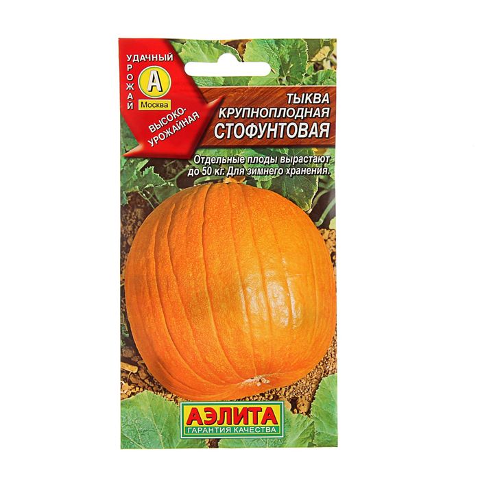 Тыква «Стофунтовая» — один из самых популярных крупноплодных сортов тыквы российской селекции. О том, что сорт крупноплодный, можно понять даже из названия: сто фунтов ровняется 45 килограмм. И у этой тыквы, действительно, имеется большой потенциал. Как заявлено производителями, предельной вес плодов 50 килограммов. Тем не менее, в среднем они весят от 10 до 20 килограммов.