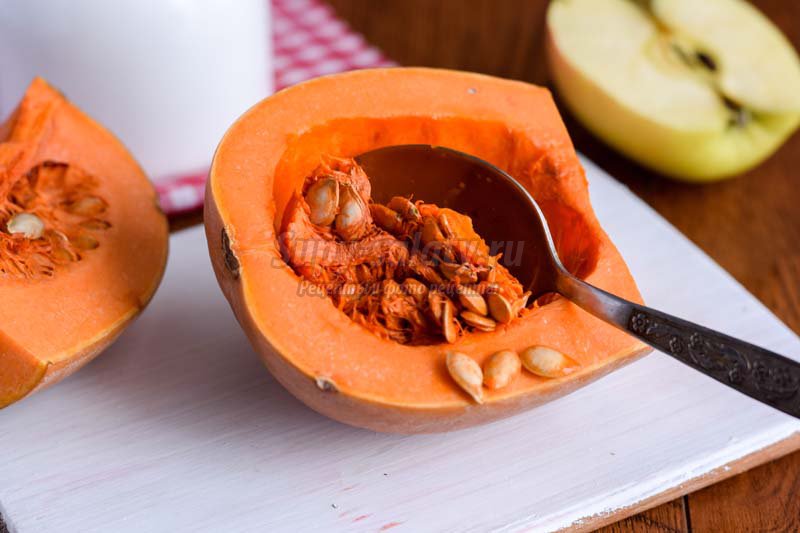 - Первым делом необходимо правильно обработать тыкву. Вымыть, зачистить. Убрать семена и волокна. Снова промыть. Отложить в сторону.