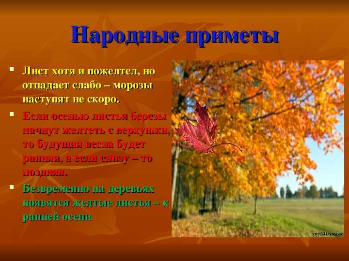 Многие народные приметы грядущей погоды связаны с изменением окраски листьев на деревьях и временем их опадания. Дружный листопад – к суровой зиме. Поздний листопад – также к суровой зиме. Ветер поворачивает листья на деревьях верхней стороной вниз – к дождю. А если летом на деревьях появляются желтые листья, то наступит ранняя осень.