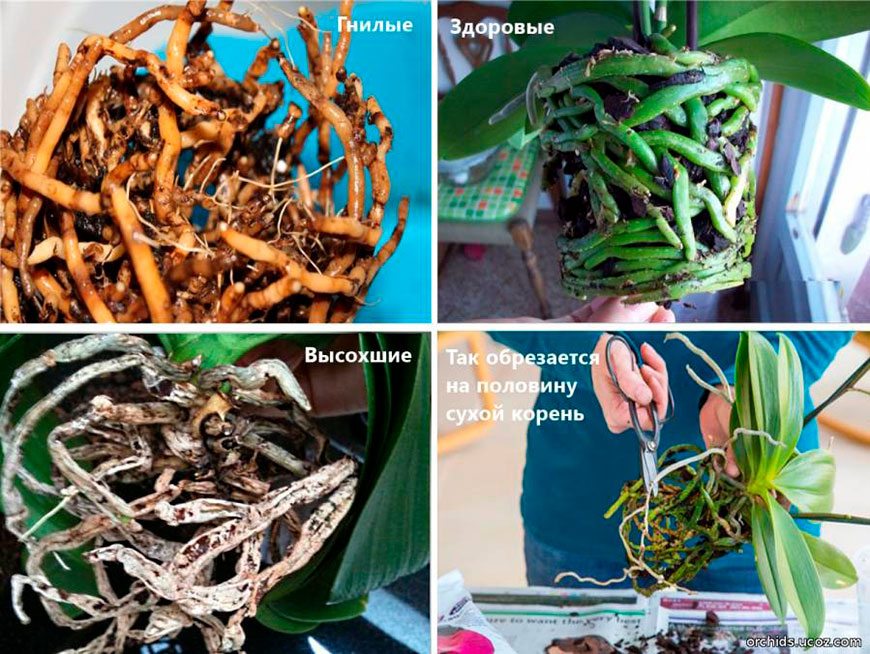 Если корневая система погибает от грибков, вызывающих гниение, от посадочного горшка исходит неприятный запах. Отмершие корешки имеют черный, бурый цвет. На них есть участки, пропитанные слизью.