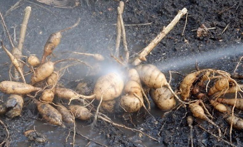 Если вы собираетесь делить клубни перед зимним хранением, следующим шагом будет удаление большей части грязи с комков, чтобы было легче идентифицировать глазки при делении . Мы сбрызгиваем грязь водой, но некоторым гроверам удается просто смахнуть грязь щеткой, как только она высохнет.