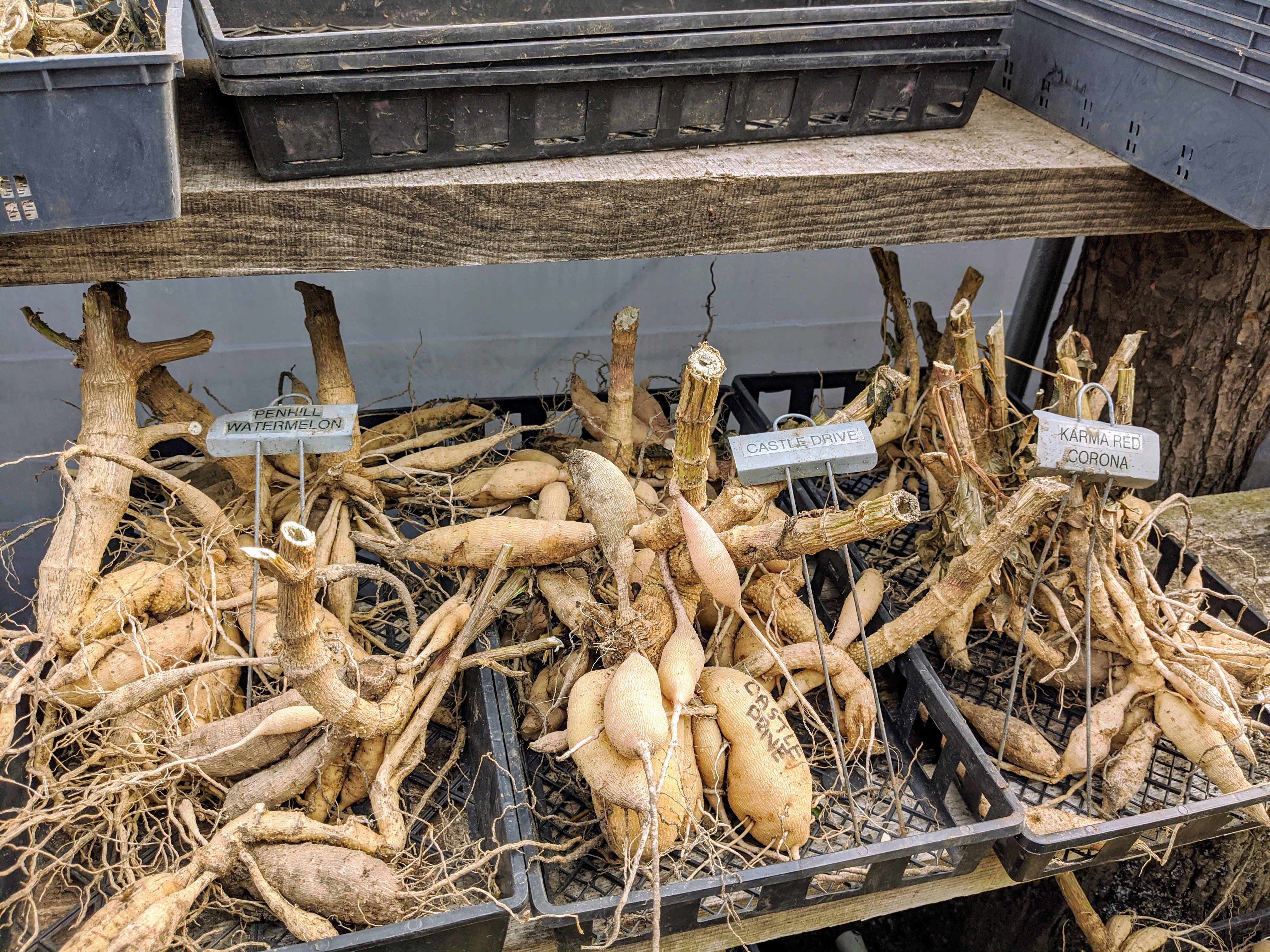 Некоторые производители ждут до весны, чтобы разделить свои клубни, но мы предпочитаем делать это поздней осенью/началом зимы. Это, как правило, менее загруженное время, глазки более опухшие и заметные, а отдельные клубни занимают часть места для хранения в виде неповрежденных комков.