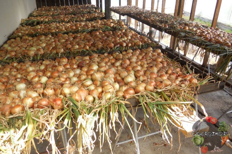 Примечательно, что первичная сушка осуществляется без его предварительной обработки. То есть листья и корни на первых порах остаются вместе с луковицей.