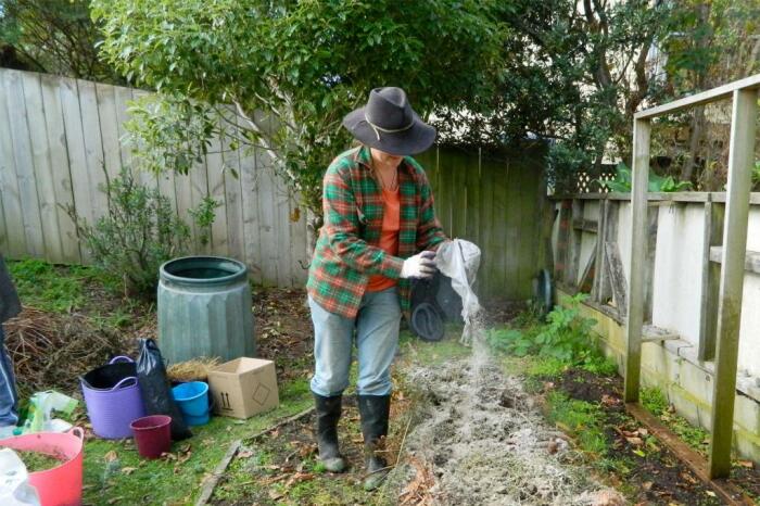 Вот секрет быстрого компостирования за один этап. Посыпьте каждый слой растительных остатков при добавлении в кучу и тщательно пропитайте удобрение.
