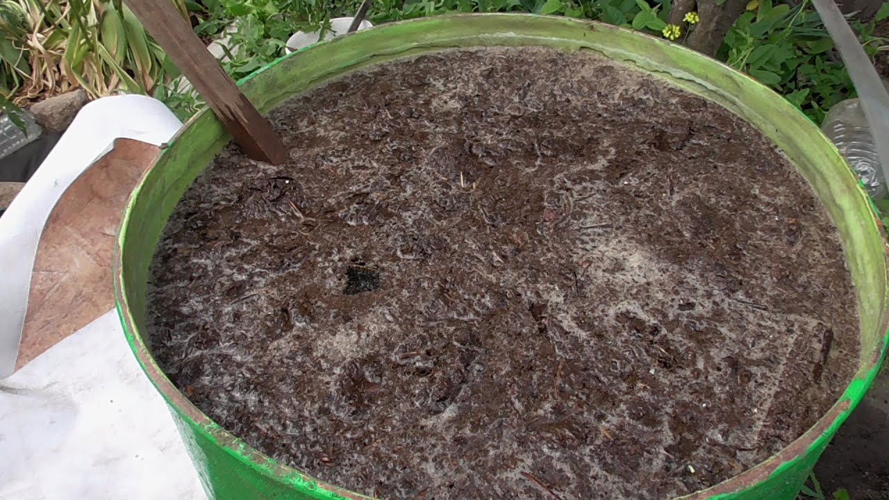 Компоненты нужно брать в равных частях. Работу делать нужно в перчатках и повязке из марли, чтобы защитить себя от зловонного аромата. Перемешивать состав надо палкой из дерева, мешать до получения однородного состава, а потом закрыть бочку крышкой или обычными досками.