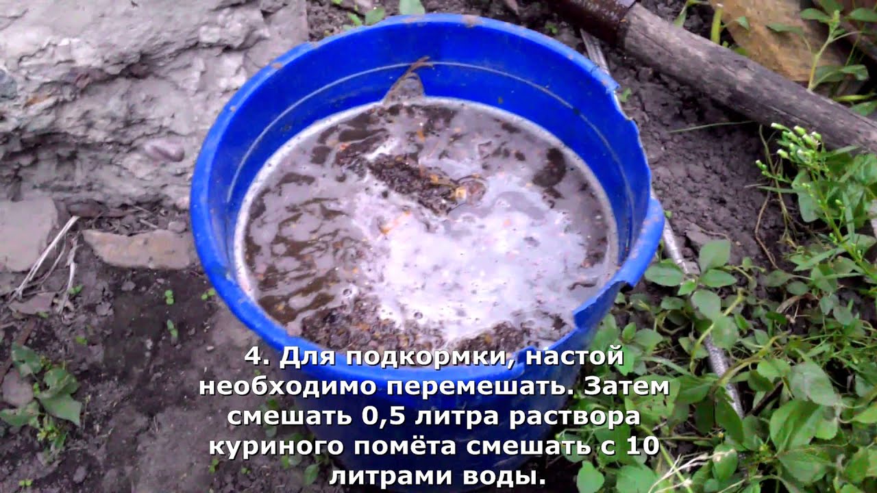 Если вы планируете применение куриного помета как удобрения на протяжении периода вегетации растений, а не только внести его перед вскапыванием грунта либо посадкой семян и рассады, рекомендуется сделать концентрированный раствор. Его надо будет потом добавлять в воду при поливе растений. Приготовить настой очень просто: емкость (например, ведро) наполовину заполняют навозом и доливают доверху водой.
