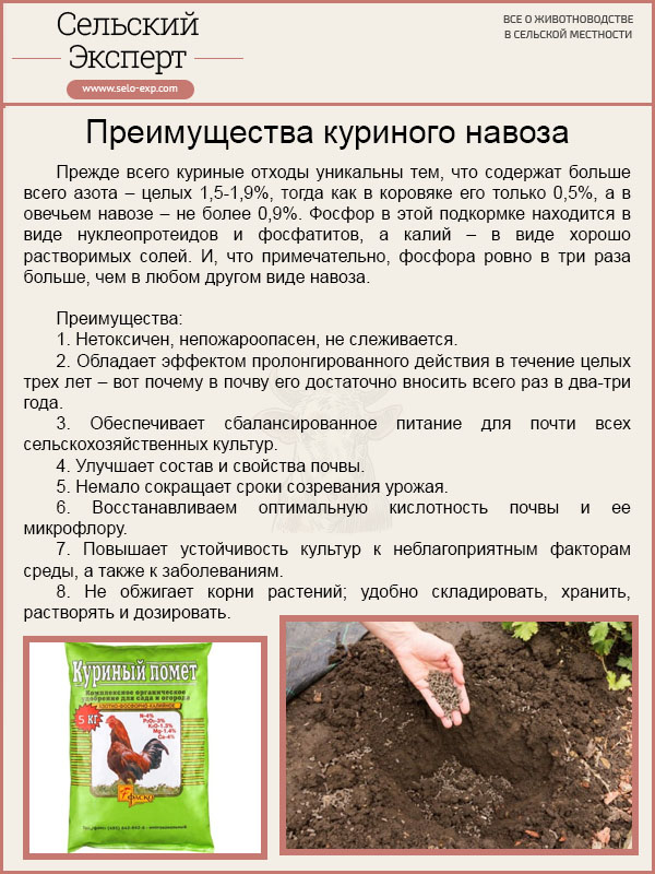 Если внести раствор куриного навоза в почву, полезные элементы легко достигают корневой системы растений и хорошо усваиваются. Благодаря органической природе удобрение не создает высокой концентрации солей и не так быстро вымывается из почвы. Такие полезные качества продукта, получаемого в результате жизнедеятельности птиц, позволяют применять его при культивировании разных овощей, корнеплодов, ягод и даже фруктов.