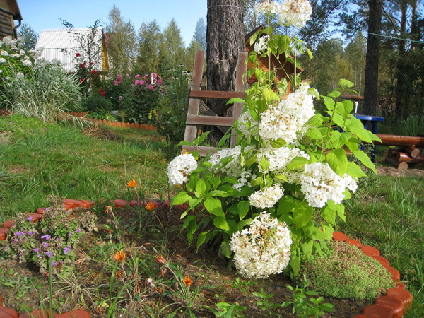 ) Ser.) — одно из моих любимых растений. Но, к сожалению, это растение теплолюбивое и подходит не для всех климатических зон, в отличие, например от гортензии древовидной (Hydrangea arborescens L.), которая более устойчива к морозам, но в Восточной Сибири тоже вымерзает, даже с укрытием. У меня в моем молодом саду растет пара кустиков крупнолистной гортензии, которые пока доставляют мне массу хлопот и не очень-то радуют своим видом. В прошлом году гортензии страдали от хлороза листьев, а потом замерзли. Этой весной я хотела их выкопать и утилизировать, но видимо «от испуга» одна гортензия начала немного цвести! Конечно, я решила ее оставить:) Но вот наступила осень, и я решила сделать для моей гортензии более надежное укрытие, чем в прошлом году… А вдруг это ее спасет от зимы и она наконец-то порадует меня таким же пышным цветением, как ее «мать». На фото ниже как раз ее «мамочка»: