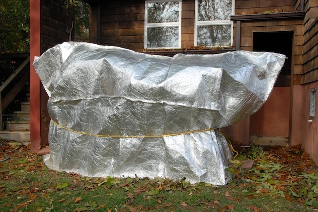 Утепление проводится после первых заморозков (-5..-10 С). Для этого возводятся шалаши. Под ними ветви стягиваются веревками к стволу, а сверху накладываются бруски дерева, закрепленные между собой шурупами. На сооружение водружаются листы минваты, которые сверху прикрываются полиэтиленом, чтобы конструкцию не промочил дождь.