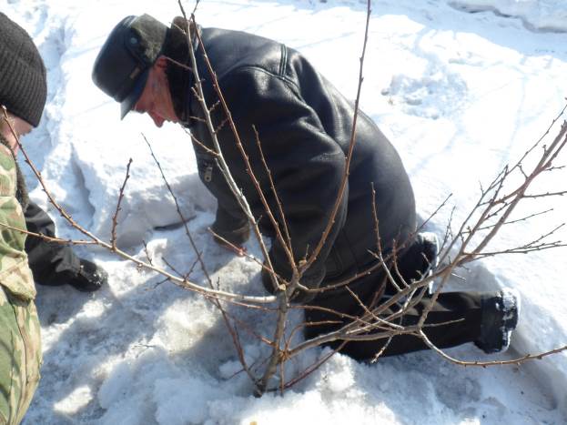 - Первый этап – пригибание молодого дерева к земле. Чем ниже его пригнуть – тем меньше сил и материала будет потрачено на его укрытие.