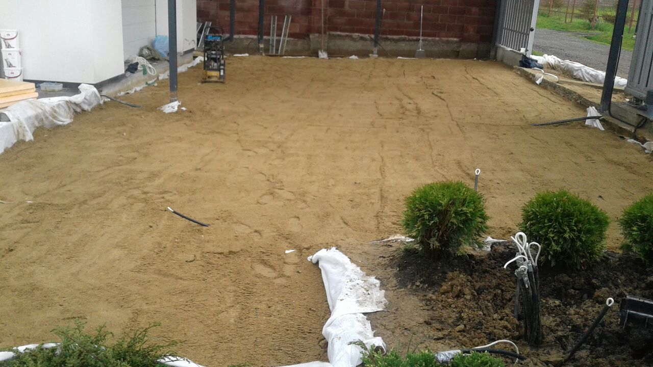 - Земляные работы. В низинах понадобится отсыпать грунт до желаемого уровня. На ровной площадке всё начинается с выемки 30-35 см грунта. Будущая парковка выравнивается по уровню.