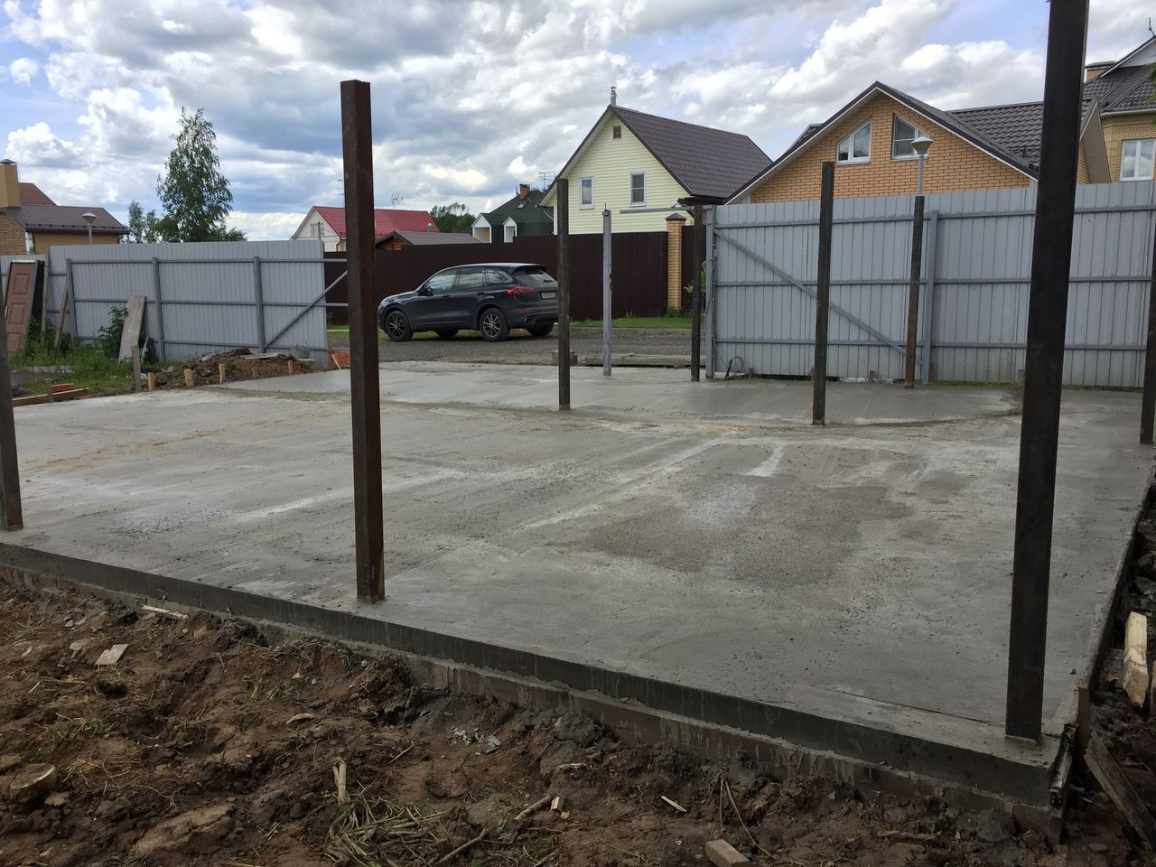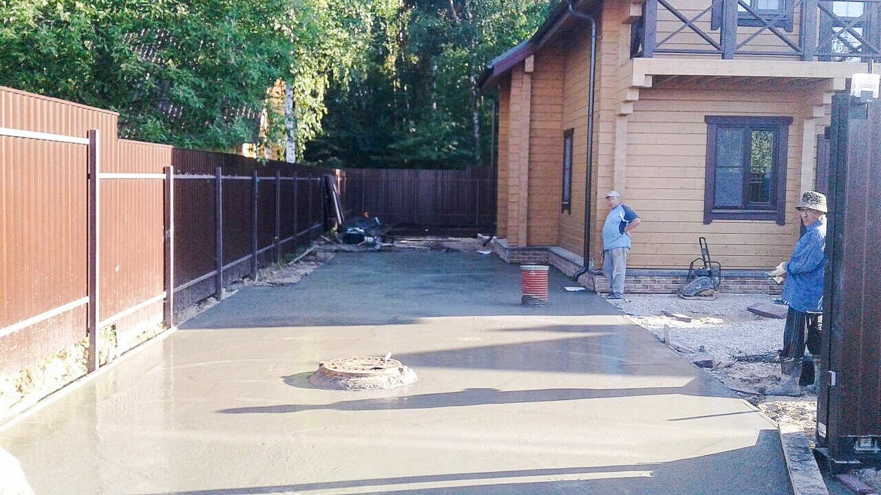 Во избежание скапливания воды необходимо обеспечить уклон и устроить ливневую канализацию. Необходимую прочность площадка наберет через месяц.