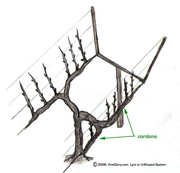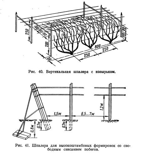 В зависимости от силы роста кустов создаются различные шпалеры как по числу натягиваемых проволок и расстояний между ними, так и по способу распределения проволок.